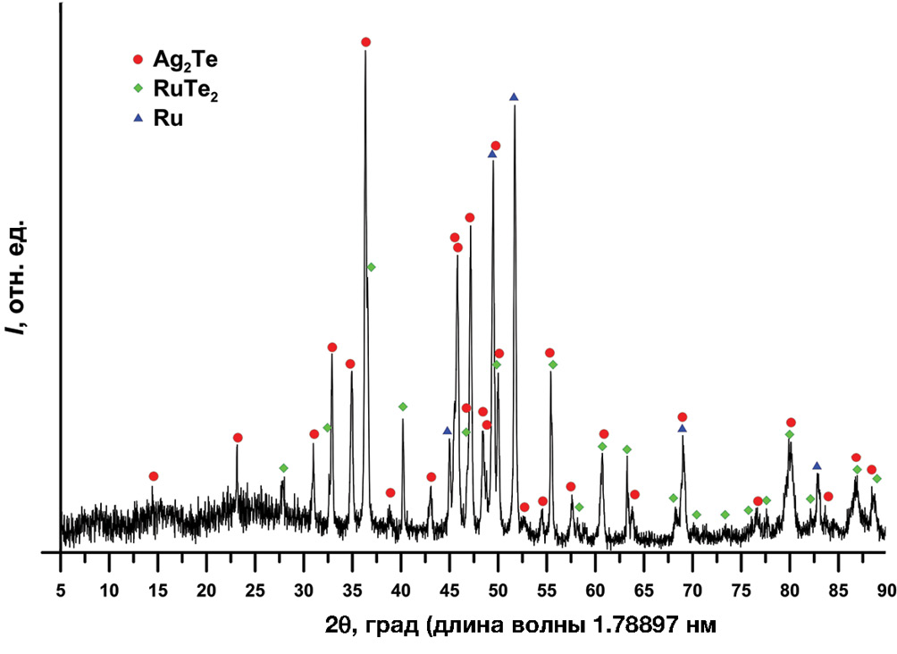 Фазовый состав образца до и после опыта подтверждался рентгенофазовым анализом (РФА): карты PDF #65-1104, #06-0663 и #79-0252 для Ag2Te, Ru и RuTe2 со структурой пирита соответственно. Результаты РФА (рис. 1) поверхности таблетированного образца после опыта со стороны контакта с твердым электролитом подтверждают наличие только трех фаз: Ag2Te, RuTe2 и Ru, что соответствует исходному составу электрохимической ячейки (I). Этот же образец изучали в отраженном свете оптического микроскопа и на электронном сканирующем микроскопе Tescan Vega II XMU в режиме обратно-рассеянных электронов и характеристических излучений элементов. Никаких взаимодействий (взаимной растворимости) не обнаружено.