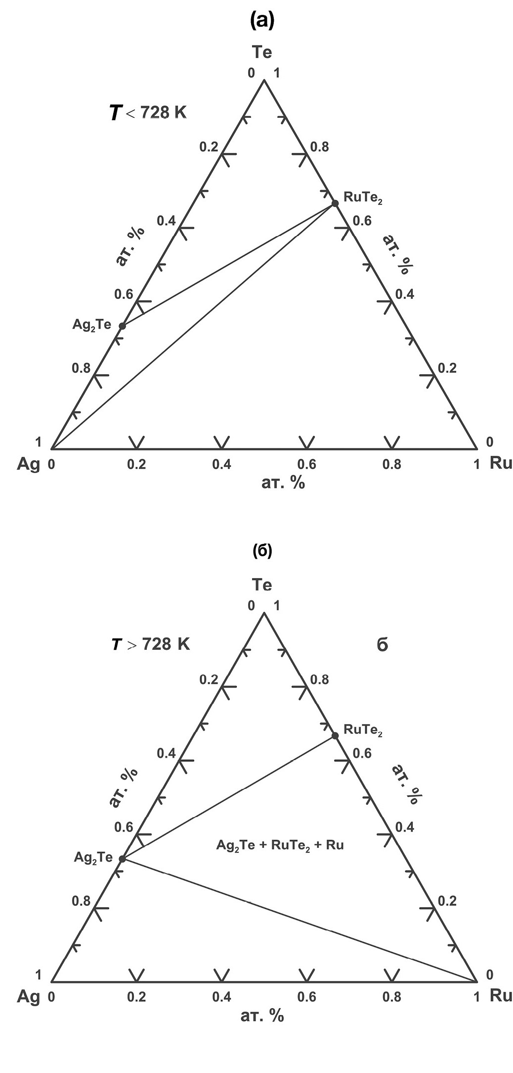 Рис. 3. Фазовая диаграмма Ag–Ru–Te ниже (а) и выше (б) температуры 728 K, при которой происходит смена конод