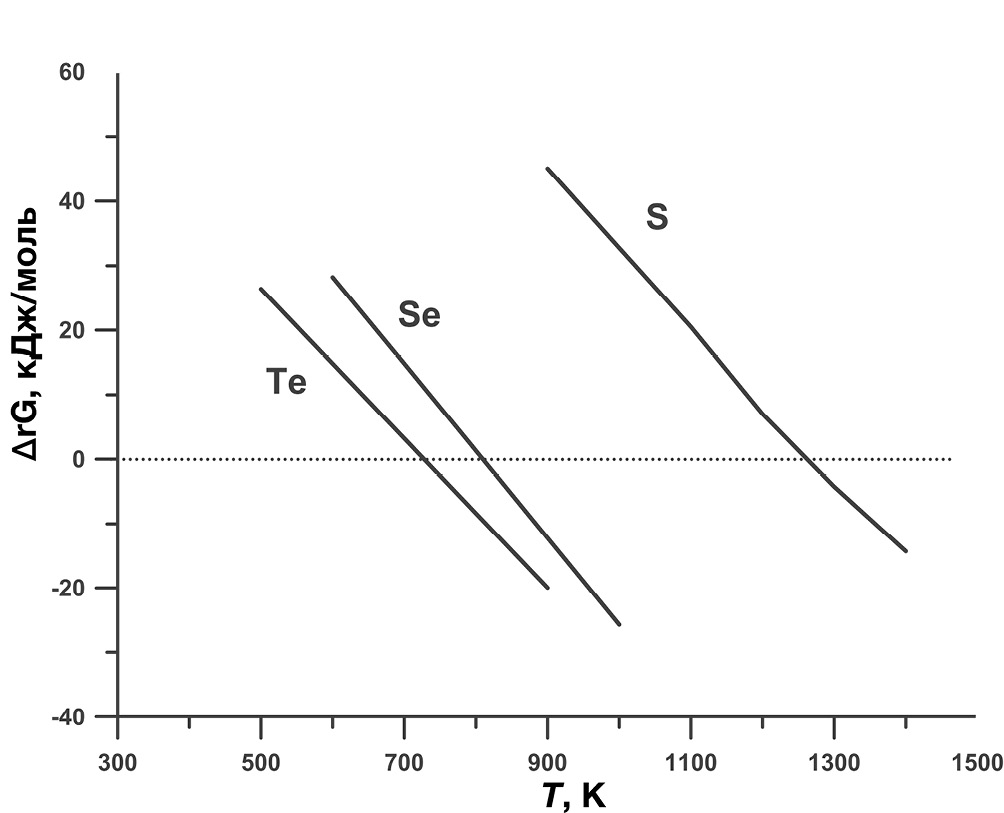 На рис. 4 показаны температурные зависимости энергии Гиббса реакции (5). Оценка температур смены конод в сульфидной и селенидной системах, по аналогии с теллуридной (рис. 3), дает значения 1262 и 810 K соответственно. Для сульфидной системы оно оказалось выше температуры плавления серебра (1235 K) и Ag2S (1233 K) [15].