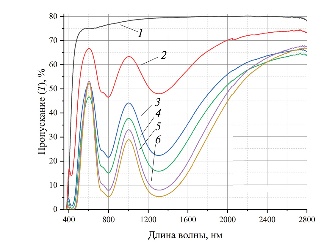 Перед исследованием пропускания образцы полировали с использованием алмазного порошка, а их толщину измеряли при помощи электронного микрометра. Спектры регистрировали на спектрофотометре Shumadzu UV-3600 в диапазоне длин волн 0.35 до 2.80 мкм.