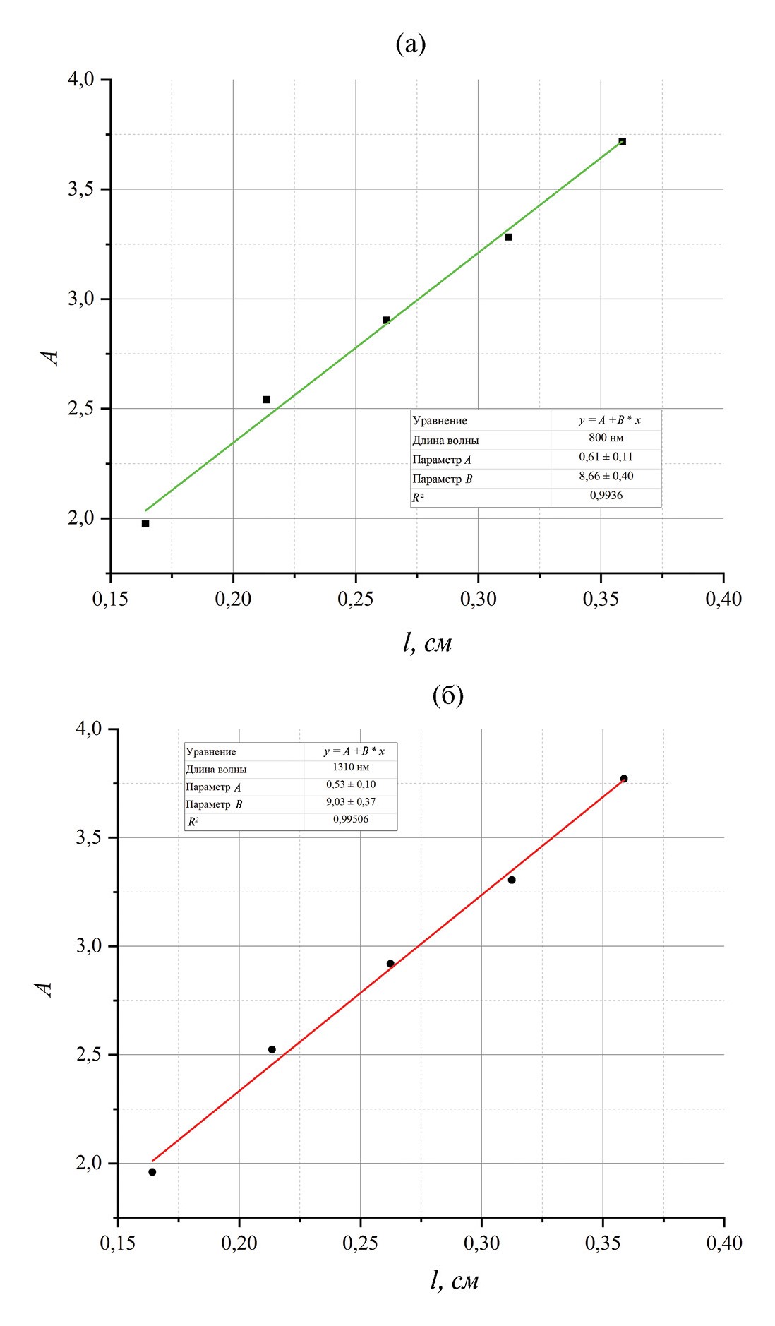 Рис. 2. Зависимости абсорбционности от толщины стекла на длине волны 0.80 (а) и 1.32 мкм (б) в образце, содержащем 0.6 мас. % Ni2+
