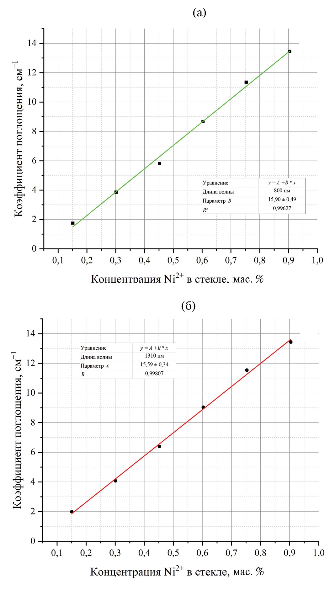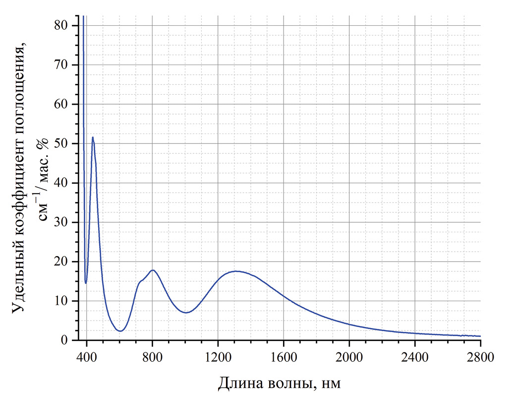 Удельный коэффициент поглощения ионов никеля(2+) рассчитан во всем диапазоне прозрачности стекла и в максимуме полосы при 0.80 мкм равен 15.9 ± 1.3 см−1/мас. %. Значение интегрального коэффициента поглощения в диапазоне волновых чисел 3600–16500 см−1 составило 10.6 ± 0.5 см−2/ppm.
