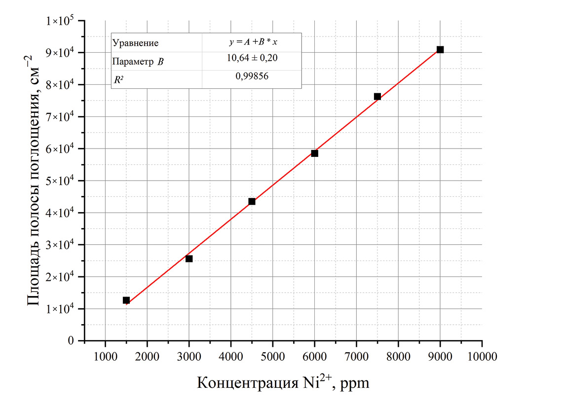 Рассчитанное значение интегрального коэффициента поглощения в диапазоне волновых чисел 3600−16500 см−1, равное 10.6 ± 0.5 см−2/ppm, позволяет дополнительно выявить поглощающую способность атомов никеля и оценить его минимальное содержание в заданном спектральном диапазоне.