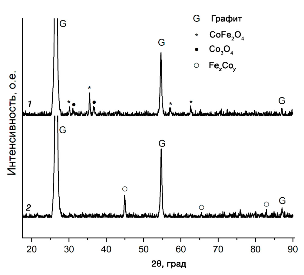 При проведении процесса терморасширения на воздухе металлсодержащая фаза в ПГ-FeCo-воздух представлена в основном в виде ферримагнитного феррита кобальта CoFe2O4 со структурой обращенной шпинели (рис. 1, дифрактограмма 1), который является продуктом разложения смеси нитратов железа и кобальта. Исходное мольное соотношение Fe3+ : Co2+ в нитратах составляло 1 : 1, поэтому избыток нитрата кобальта разложился до Co3O4, фаза которого также была идентифицирована.