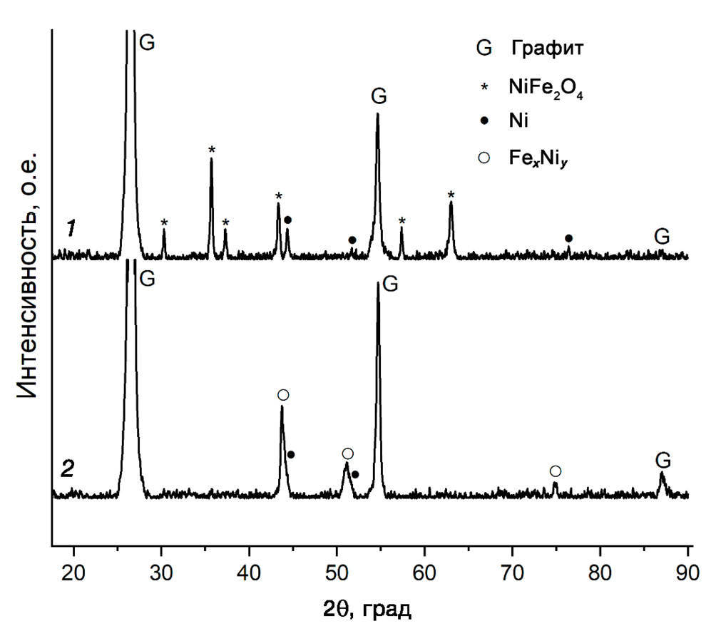 При терморасширении смеси ОГ, нитратов Fe3+/Ni2+ и меламина на воздухе образуется фаза ферримагнитного феррита никеля NiFe2O4 (рис. 2, дифрактограмма 1). Также присутствует фаза металлического никеля, который, вероятно, является продуктом восстановления NiO, образующегося при разложении нитрата Ni2+.