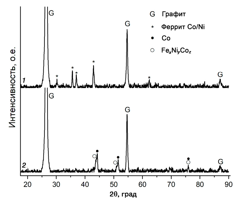 Термообработка смеси ОГ с нитратами Fe3+/Co2+/Ni2+ и меламином на воздухе приводит к образованию образца ПГ-FeCoNi-воздух, металлсодержащая фаза которого представлена, судя по всему, смешанным ферритом Co/Ni (рис. 3, дифрактограмма 1).