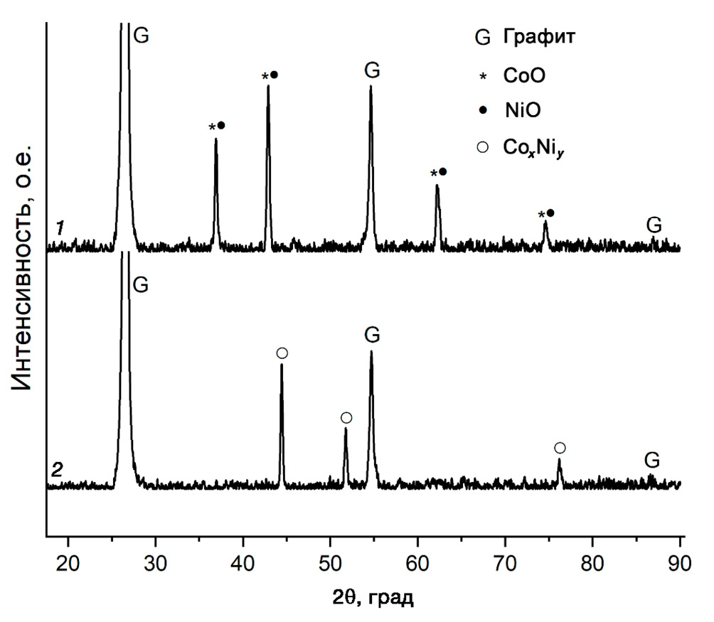 Металлсодержащая фаза образца ПГ-CoNi-воздух представлена смесью оксидов CoO и NiO (рис. 4, дифрактограмма 1) и не обладает ферро- или ферримагнитными свойствами, поэтому этот образец (единственный из всех) не чувствителен к воздействию сильного постоянного магнита. При термообработке той же смеси в атмосфере азота образуется ПГ-CoNi-N2, содержащий сплав кобальта и никеля с ГЦК-решеткой (а = 3.534 ± 0.001 Å) (рис. 4, дифрактограмма 2).