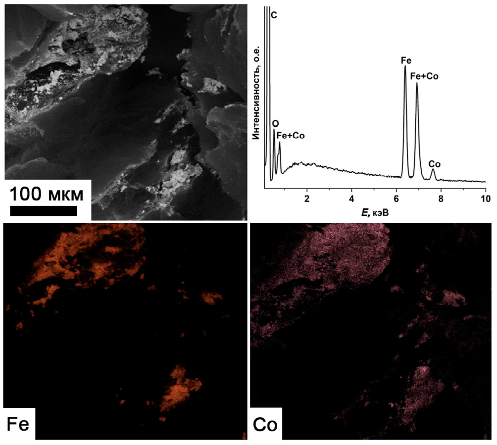 Рис. 5. Изображение СЭМ, EDX-спектр и элементное картирование поверхности образца ПГ-FeCo-N2