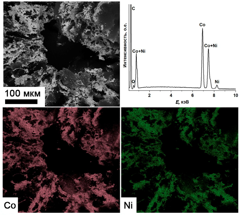 Рис. 6. Изображение СЭМ, EDX-спектр и элементное картирование поверхности образца ПГ-CoNi-N2