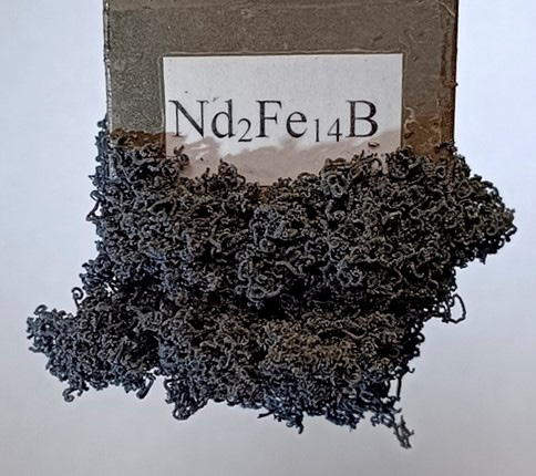 Рис. 7. Образец ПГ-FeCoNi-N2, содержащий сплав железа с никелем и кобальтом, притянутый к магниту
