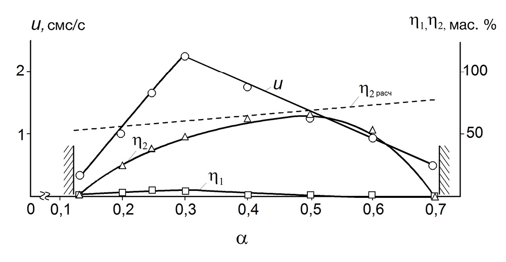 По мере увеличения содержания алюминия в исходной шихте в интервале 0.125 ≤ α ≤ 0.3 скорость горения возрастает линейно (рис 2). При α = 0.3 скорость горения достигает максимального значения (u = 2.2 см/с). Дальнейшее увеличение содержания алюминия в смеси приводит к монотонному снижению скорости горения. В ходе выполненных экспериментов были зафиксированы два концентрационных предела по распространению фронта горения по исследуемым смесям. Установлено, что при α < 0.125 и α > 0.7 горение железо-алюминиевого термита прекращается. Экспериментальные исследования показали, что область синтеза литых алюминидов железа ограничена диапазоном 0.2 < α < 0.6. Зависимость относительного выхода металлической фазы в слиток (η2) проходит через максимум и существенно зависит от содержания алюминия в исходной шихте. Зависимости относительного выхода металлической фазы η2 в слиток и расчетного теоретического выхода не совпадают. Максимальное совпадение этих кривых отмечается в диапазоне 0.4 < η2 < 0.5.