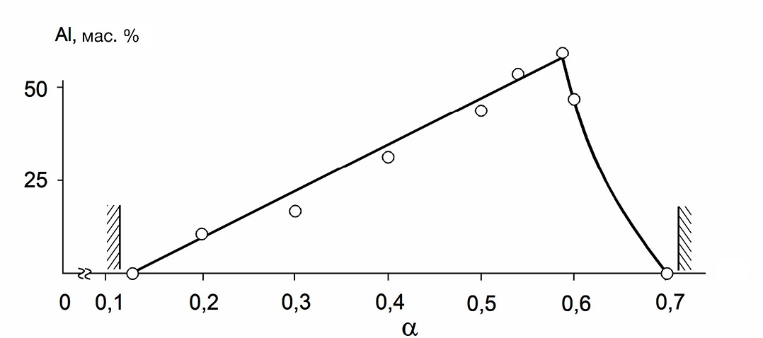 По данным химического анализа, содержание связанного алюминия в синтезированных литых алюминидах железа существенно зависит от содержания алюминия в исходной смеси. Рост содержания алюминия в исходной смеси в диапазоне 0.15 < α < 0.6 приводит к росту связанного алюминия в литых алюминидах железа 0.1 < α < 59.9 мас. % (рис. 3). В этом случае содержание алюминия в слитках меняется практически линейно до α = 0.58. При α > 0.58 из-за понижения температуры горения экзотермической смеси доля связанного алюминия резко снижается.