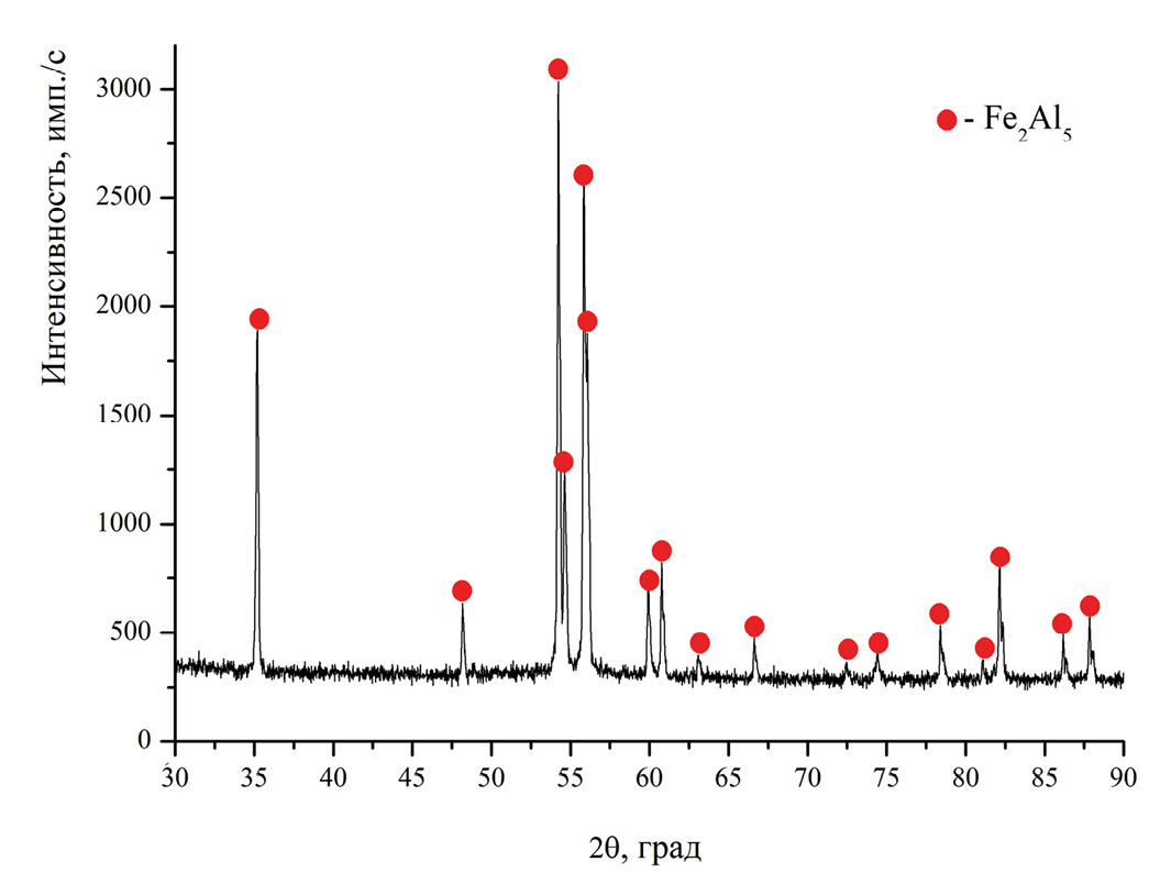 В настоящей работе был использован железо-алюминиевый термит с трехвалентным оксидом железа в качестве окислителя. Такая замена обеспечила значительное повышение температуры горения исследуемых смесей для синтеза интерметаллидов [18]. Ранее эта методика была апробирована при синтезе однофазного литого алюминида железа Fe2Al5 [19].