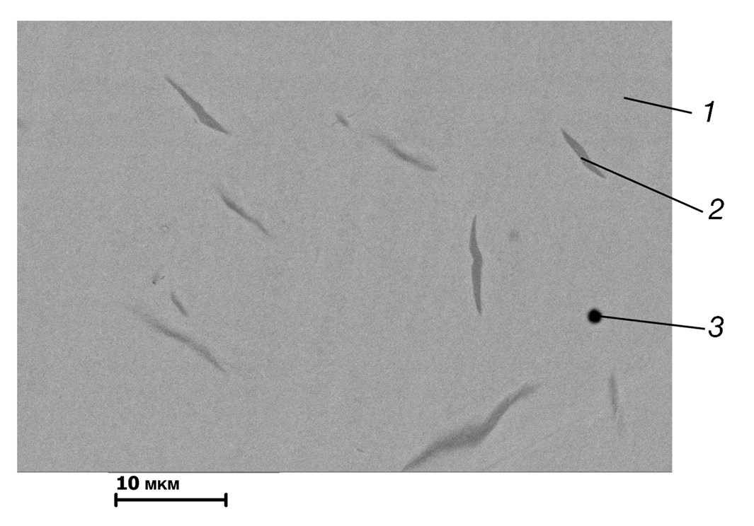 На рис. 7 представлена микроструктура алюминида железа Fe3Al (α = 0.3). Визуально на шлифе можно выделить три структурные составляющие: 1 — основа, 2 — игольчатые включения, 3 — сферические включения.