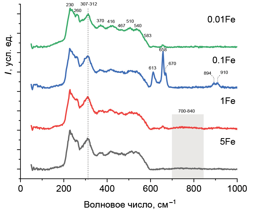 КРС-спектроскопия. В КРС-спектрах AlON:Fe c концентрацией железа 0.01, 0.1, 1 и 5 ат. % (рис. 3) наблюдаются интенсивные полосы с максимумами при 230 и 311 см−1, несколько перекрывающихся полос при 260, 370, 416, 467, 510, 540, 583 см−1 и слабая широкая полоса в диапазоне 700–840 см−1.