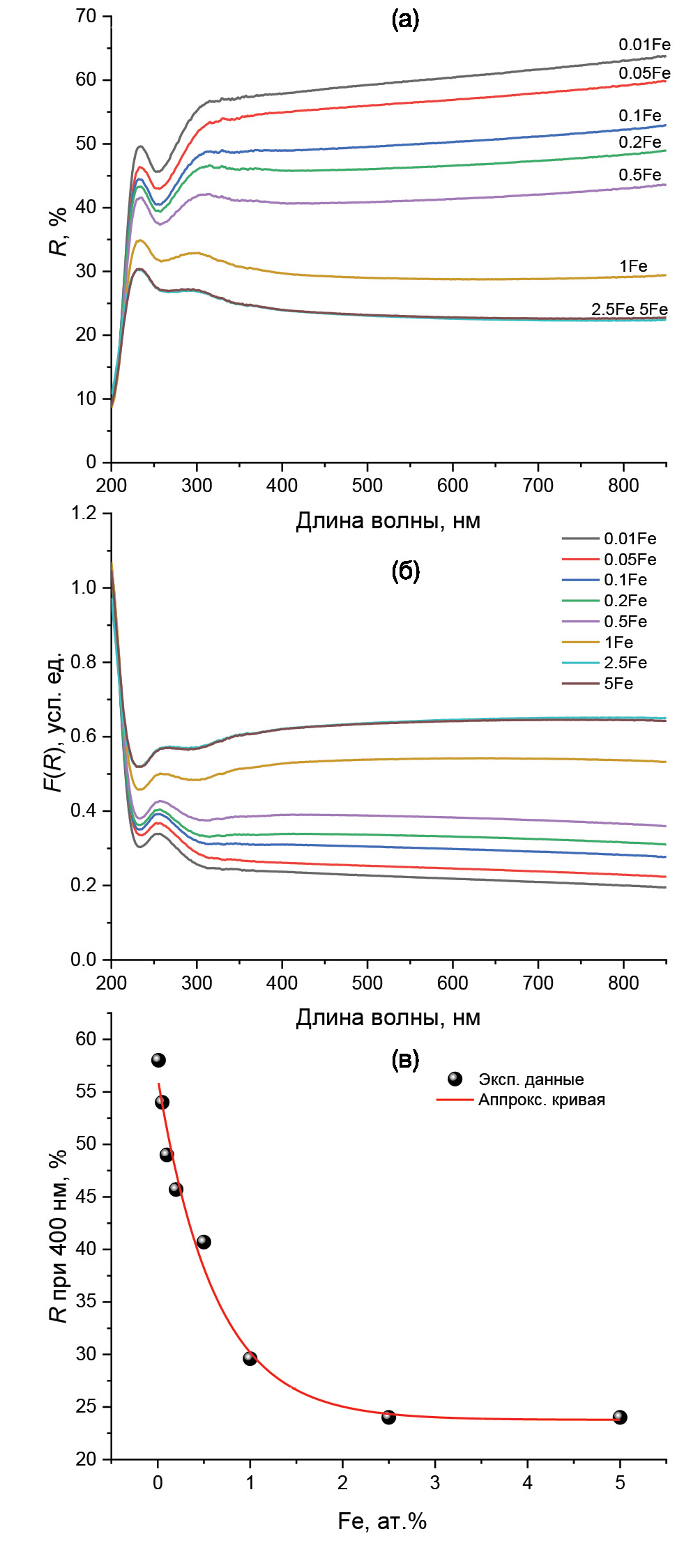 Оптические свойства. Спектры диффузного отражения образцов AlON:Fe (рис. 4а) показывают, что при увеличении концентрации железа в AlON коэффициент отражения образцов уменьшается с 58 до 24% на длине волны 400 нм по экспоненциальному закону (рис. 4в).
