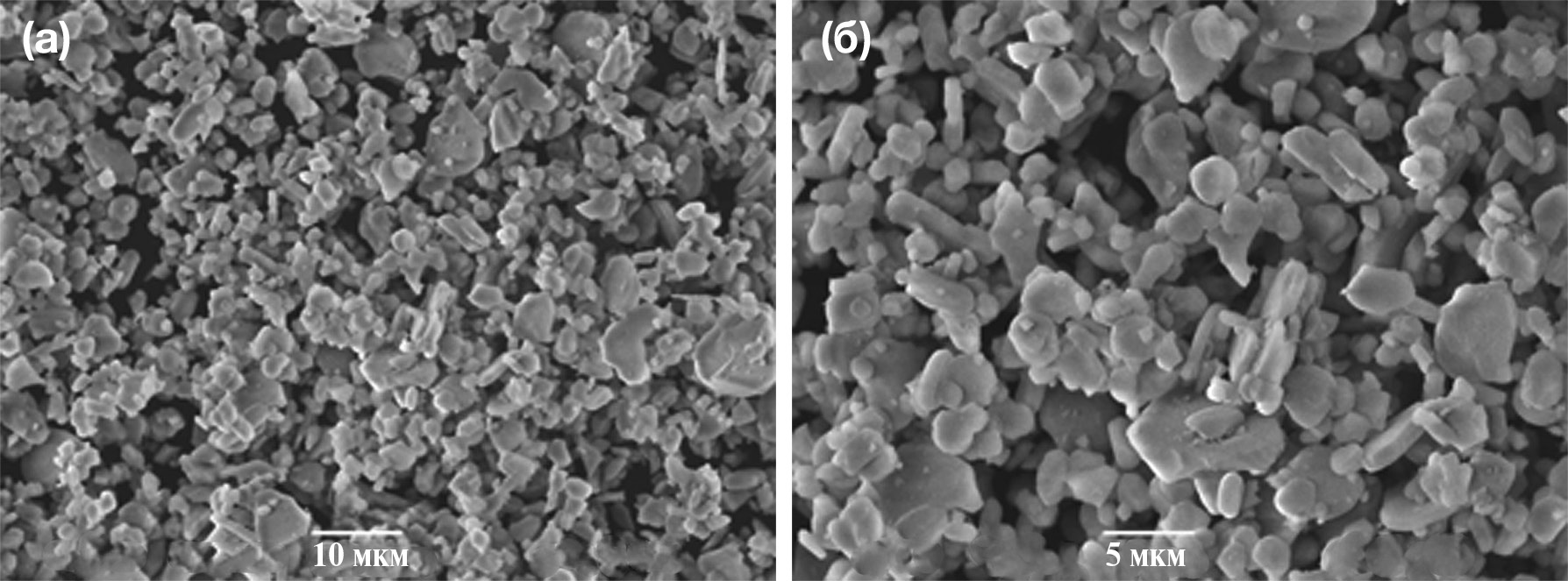В качестве основы для керамики был выбран корундоциркониевый композит состава 85 мас. % Al2O3 и 15 мас. % ZrO2, стабилизированный 3 мол. % Y2O3 (3YSZ). Оксид алюминия в форме корунда получали из глинозема Г-00 производства Богословского горно-обогатительного комбината прокалкой при температуре 1350°С в течение 2 ч, порошок 3YSZ синтезировали методом совместного осаждения с последующими промывкой, сушкой и прокалкой осадка при температуре 1100°С в течение 2 ч по технологии, описанной в [21]. На рис. 1 представлена морфология используемого для керамики корунда.