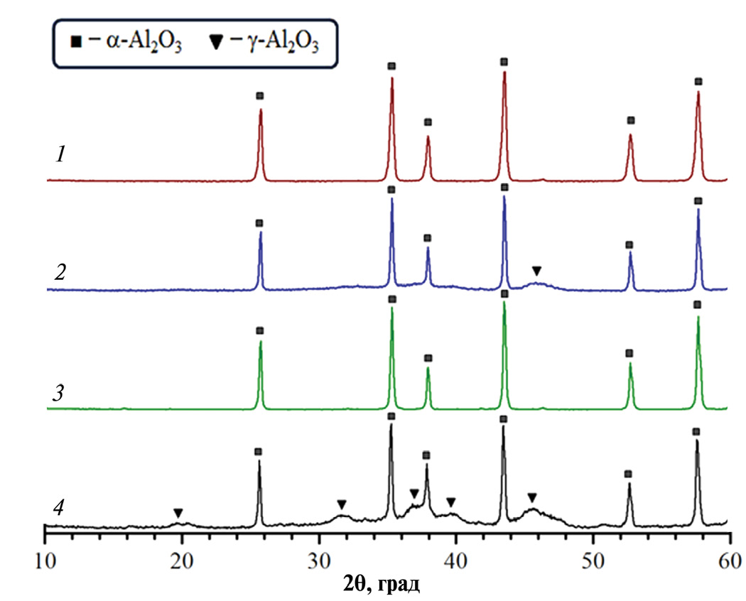 Спекающие добавки различались не только морфологией частиц, но и фазовым составом (рис. 5). В порошке оксида алюминия, полученного методом SCS с глицином, формирование корунда происходит при температуре 1100°С (рис. 5, дифрактограмма 1). При синтезе с мочевиной температура начала формирования корунда снижается [18, 19], после отжига при 900°С в образце доминирует фаза α-Al2O3 и присутствуют следы γ-фазы (рис. 5, дифрактограмма 2), после отжига при 1100°С полностью формируется структура корунда (рис. 5, дифрактограмма 3). Образец сравнения оксид алюминия “ч.” содержит доминантную фазу α-Al2O3 и слабо закристаллизованную фазу γ-Al2O3 (рис. 5, дифрактограмма 4). Надо отметить, что увеличение в составе добавки доли γ-Al2O3 явно коррелирует с возрастанием плотности и твердости керамики при спекании.
