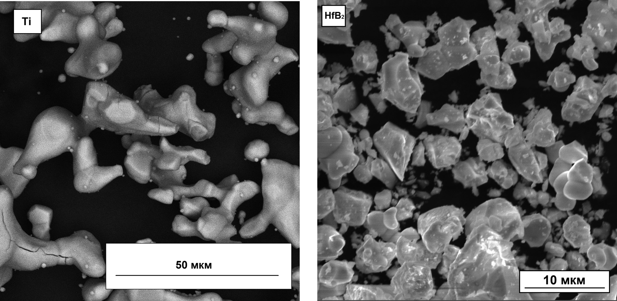 РЭМ изображения исходных порошков титана и диборида гафния представлены на рис. 1. Частицы порошка титана иррегулярной формы с развитой поверхностью. Частицы диборида гафния имеют поверхность, характерную для геометрически правильных кристаллитов (плоские грани, расположенные друг к другу под разными углами). Порошок диборида гафния склонен к агломерации ввиду присутствия в пробе мелкой фракции.
