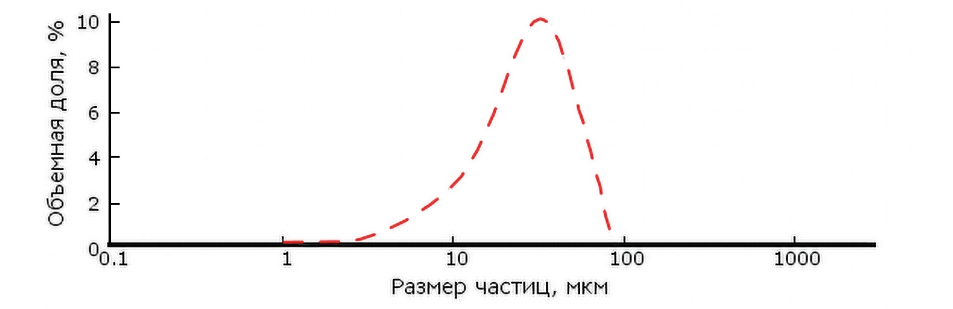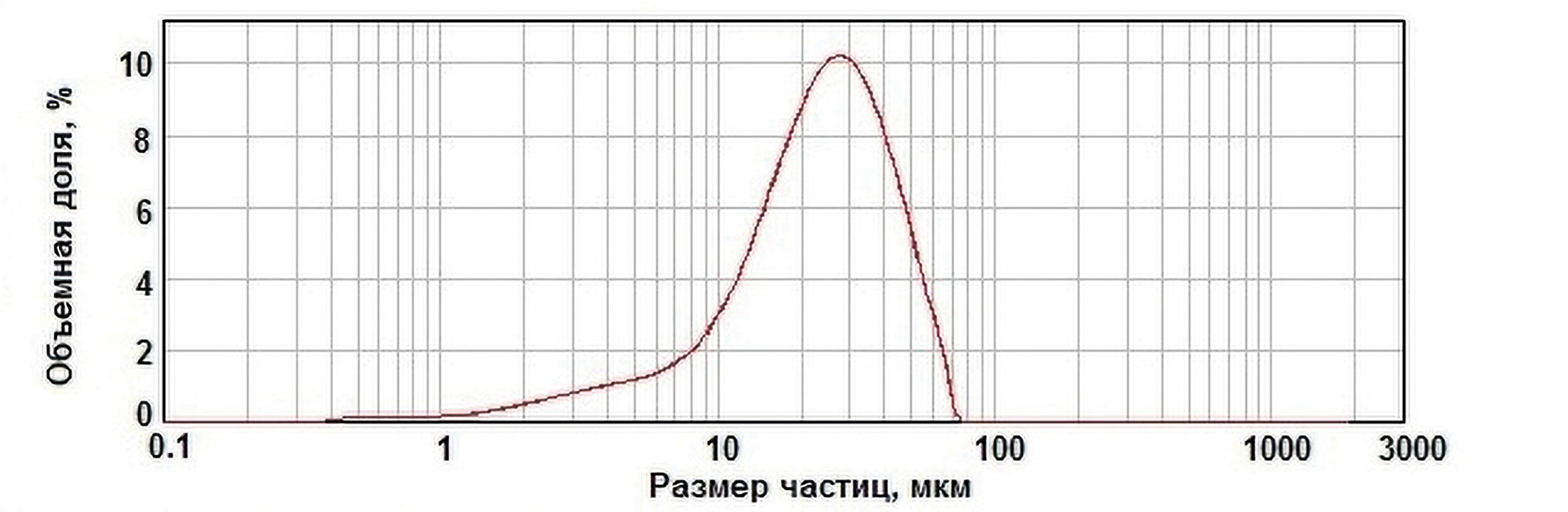 Фракционный состав порошков определяли с помощью лазерного дифракционного анализатора Malvern Mastersizer 2000, состоящего из оптического модуля, двух модулей диспергирования (Hydro S и Scirocco 2000) и персонального компьютера с программным обеспечением Mastersizer 2000. Результаты исследования фракционного состава исходных порошков титана и диборида гафния представлены на рис. 2 и 3. Диаметр частиц порошка титана находится в диапазоне от 1 до 95 мкм. Максимальная объемная доля, равная 10% соответствует диаметру частиц порядка 32–36 мкм. Порошок диборида гафния мелкодисперсный и склонен к агломерации. Его максимальная объемная доля в пробе (4.7%) приходится на диапазон 6–10.5 мкм.