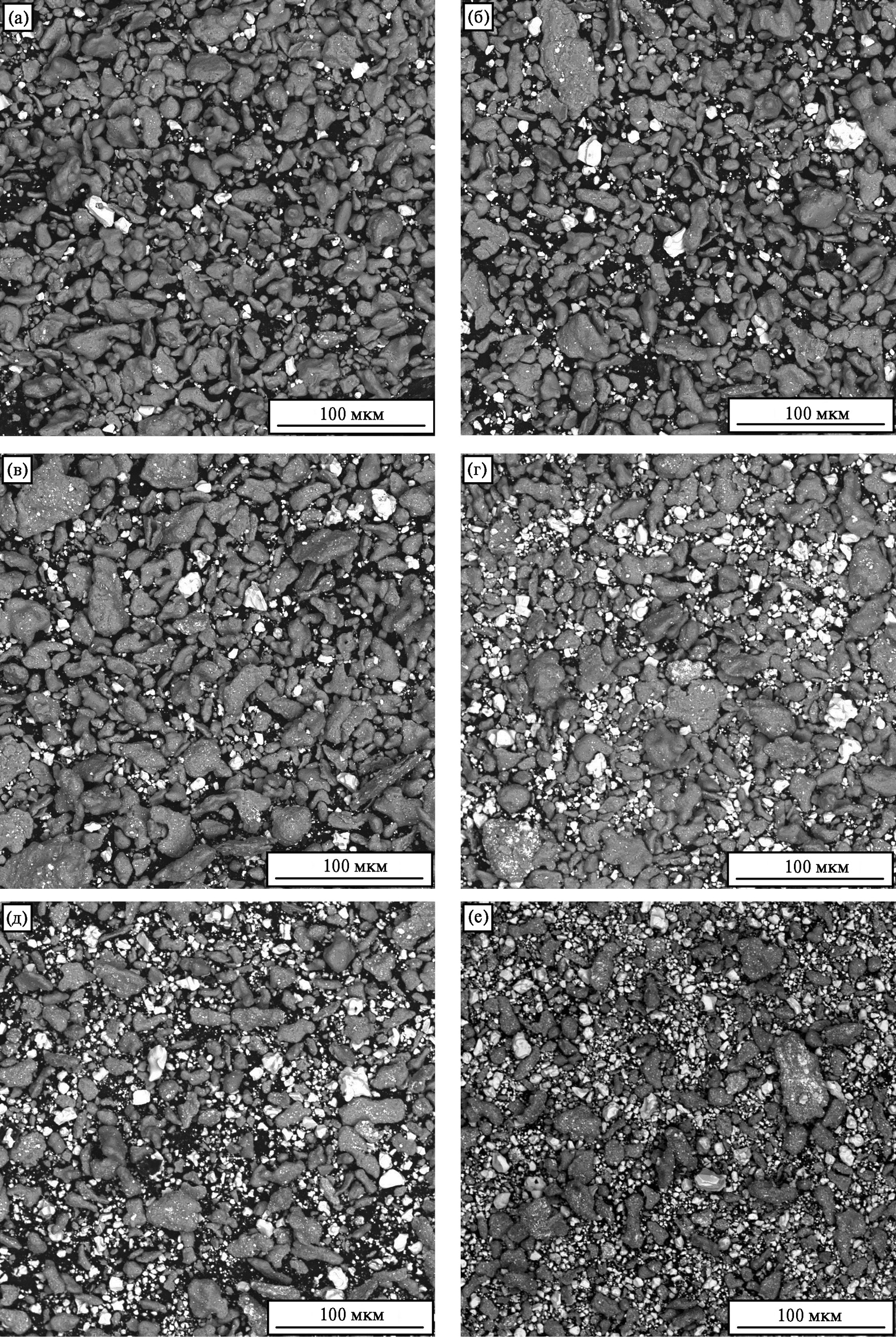 Рис. 5. Микрофотографии композиционного порошка Ti/HfB2 с содержанием HfB2 (мас. %): а – 10, б – 20, в – 30, г – 40, д – 50, е – 60