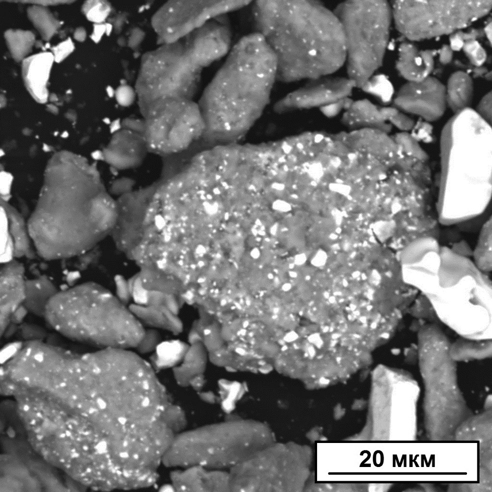Характерная композиционная частица представлена на РЭМ-снимке (рис. 6), где частицы диборида гафния отличаются светлым контрастом и значительно меньшим размером, чем частицы матричного порошка титана.