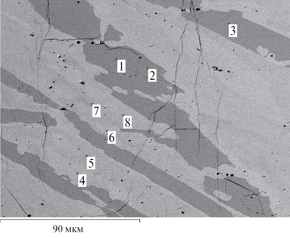 На рис. 2 и 3 в виде СЭМ-изображений показаны микроструктуры двух образцов из трехфазных областей равновесий τ8–τ9–τ10 и τ4–τ8–τ9 (присутствие фазы τ9 во втором сплаве установлено методом РФА). Цифрами отмечены точки, в которых проводились замеры концентраций.