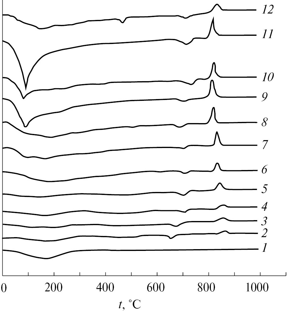 Рис. 1. ДТА-кривые исходного диатомита (1) и обработанных образцов (2–12) (температура обработки 95 °C, продолжительность 6 ч); молярное отношение CaO : SiO2 в исходной смеси: 2 – 0.05, 3 – 0.1, 4 – 0.2, 5 – 0.3, 6 – 0.4, 7 – 0.5, 8 – 0.6, 9 – 0.7, 10 – 0.8, 11 – 0.9, 12 – 1.15