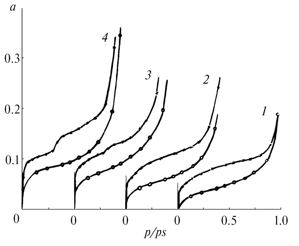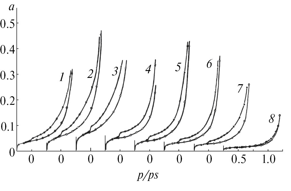 Изотермы адсорбции паров воды и бензола для исследуемых образцов (рис. 2, 3) после их известковой обработки имеют гистерезис типа Б по классификации Де-Бура [24], характерный для слоистых адсорбентов [19, 20]. Ширина петля гистерезиса увеличивается с ростом молярного отношения CaO : SiO2 в исходной смеси. На дeсорбционных ветвях в интервалах p : ps = 0.20–0.25 (при адсорбции паров бензола) и 0.25–0.3 (при адсорбции паров воды) наблюдается изгиб, вызванный адсорбцией этих паров в межслоевом пространстве новообразующихся гидрометасиликатов кальция типа C–S–H(I).