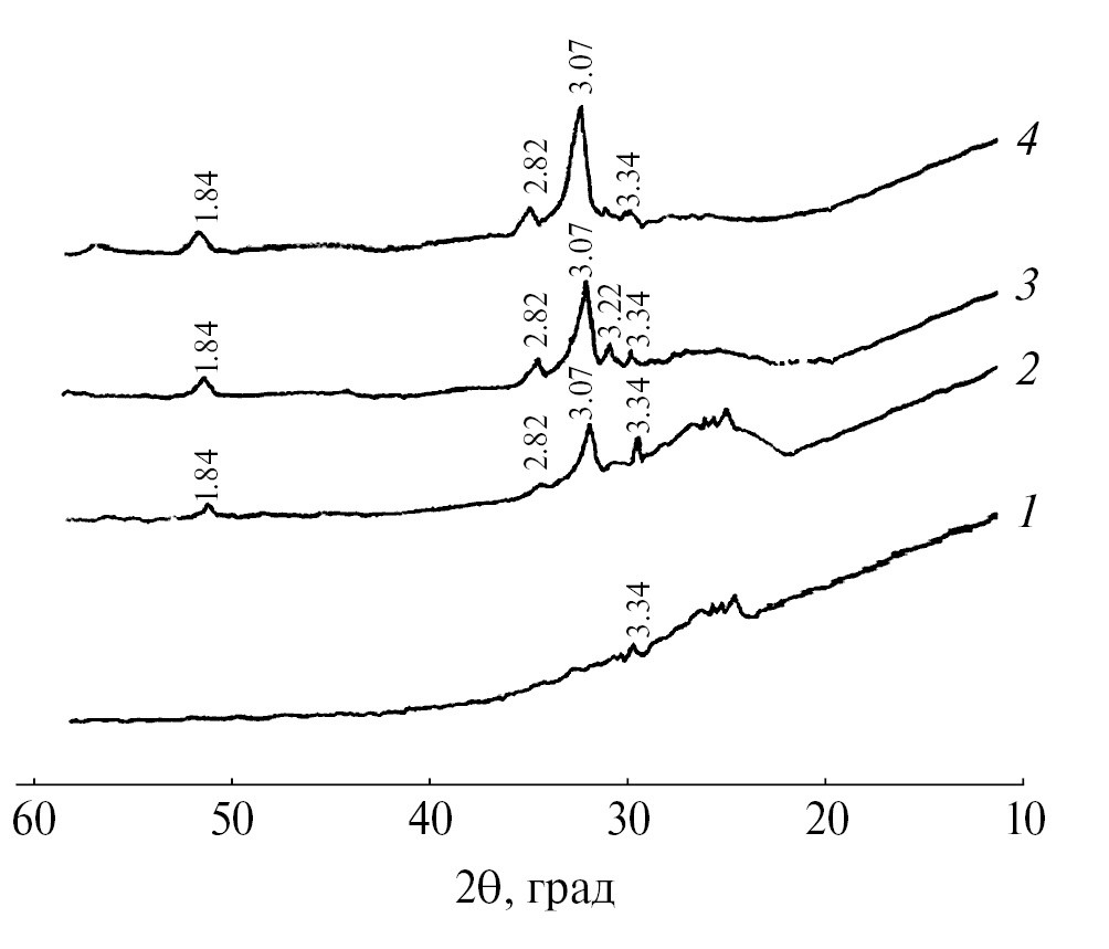 Рис. 4. Дифрактограммы исходного диатомита (1) и обработанных образцов (2–4) (температура обработки 95 °C, продолжительность 6 ч); молярное отношение CaO : SiO2 в исходной смеси: 2 – 0.2, 3 – 0.4, 4 – 0.8