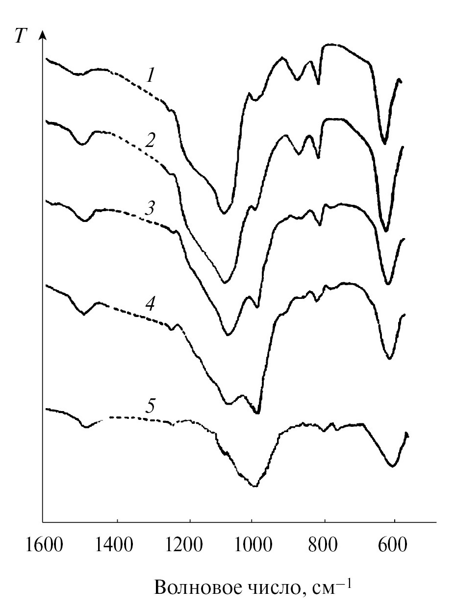 Рис. 5. ИК-спектры исходного диатомита (1) и обработанных образцов (2–5) (температура обработки 95 °C, продолжительность 6 ч); молярное отношение CaO : SiO2 в исходной смеси: 2 – 0.1, 3 – 0.3, 4 – 0.8, 5 – 1.25