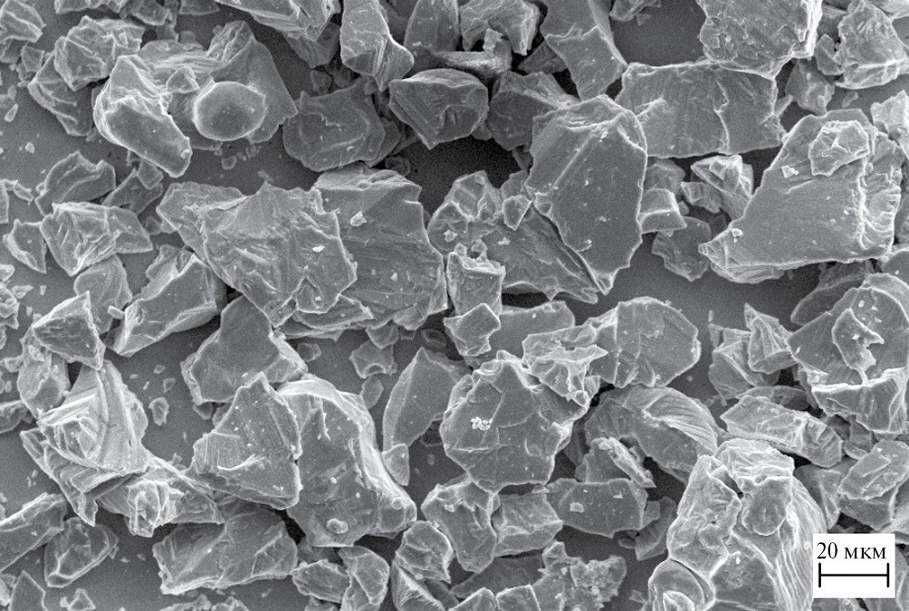 Материалы и оборудование. Гидрид титана синтезировали методом СВС-гидрирования титановой губки [1]. Использовали титановую губку марки ТГ-100 (ГОСТ 17746-96). Размер частиц титановой губки составлял от 5 до 20 мм. Полученный гидрид титана TiH2 подвергали последующему размолу и получали порошок с размером частиц менее 45 мкм чистотой 99.4 мас. %. Полученный порошок гидрида титана имел примеси (мас. %): C – 0.09; N – 0.17; O – 0.26; Fe – 0.03. Пикнометрическая плотность порошка гидрида титана составляла 3.80 ± 0.01 г/см3. На рис. 1 представлено изображение частиц порошка гидрида титана. Частицы порошка имеют оскольчатую форму.