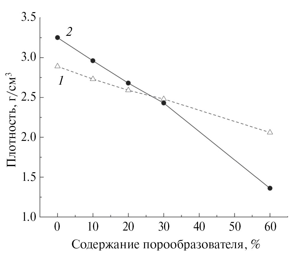 Рис. 2. Зависимости плотности прессовок (1) и образцов (2) после отжига при 800 °С от содержания порообразователя в шихте
