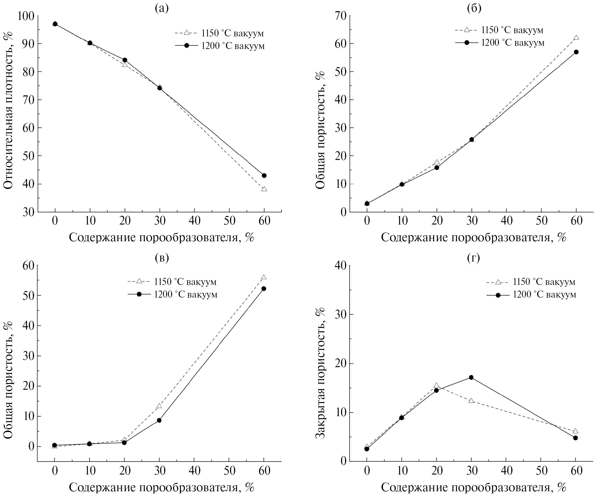 Из рис. 4 и 5 видно, что зависимости плотности и пористости от содержания порообразователя в шихте близки между собой и для температур спекания 1150 и 1200 °С. Это справедливо для спекания как в вакууме, так и в аргоне. Однако при спекании в аргоне получается материал с меньшей плотностью, особенно в области малых величин пористости. Это отчетливо видно из данных табл. 1. Вызывает интерес зависимость закрытой пористости образцов, спеченных и в вакууме, и в аргоне, от содержания порообразователя в шихте: рост до максимума при содержании порообразователя около 30%. При этом открытая пористость близких к нулю. При больших значениях содержания порообразователя – наоборот: закрытая пористость уменьшается, а открытая начинает резко возрастать.