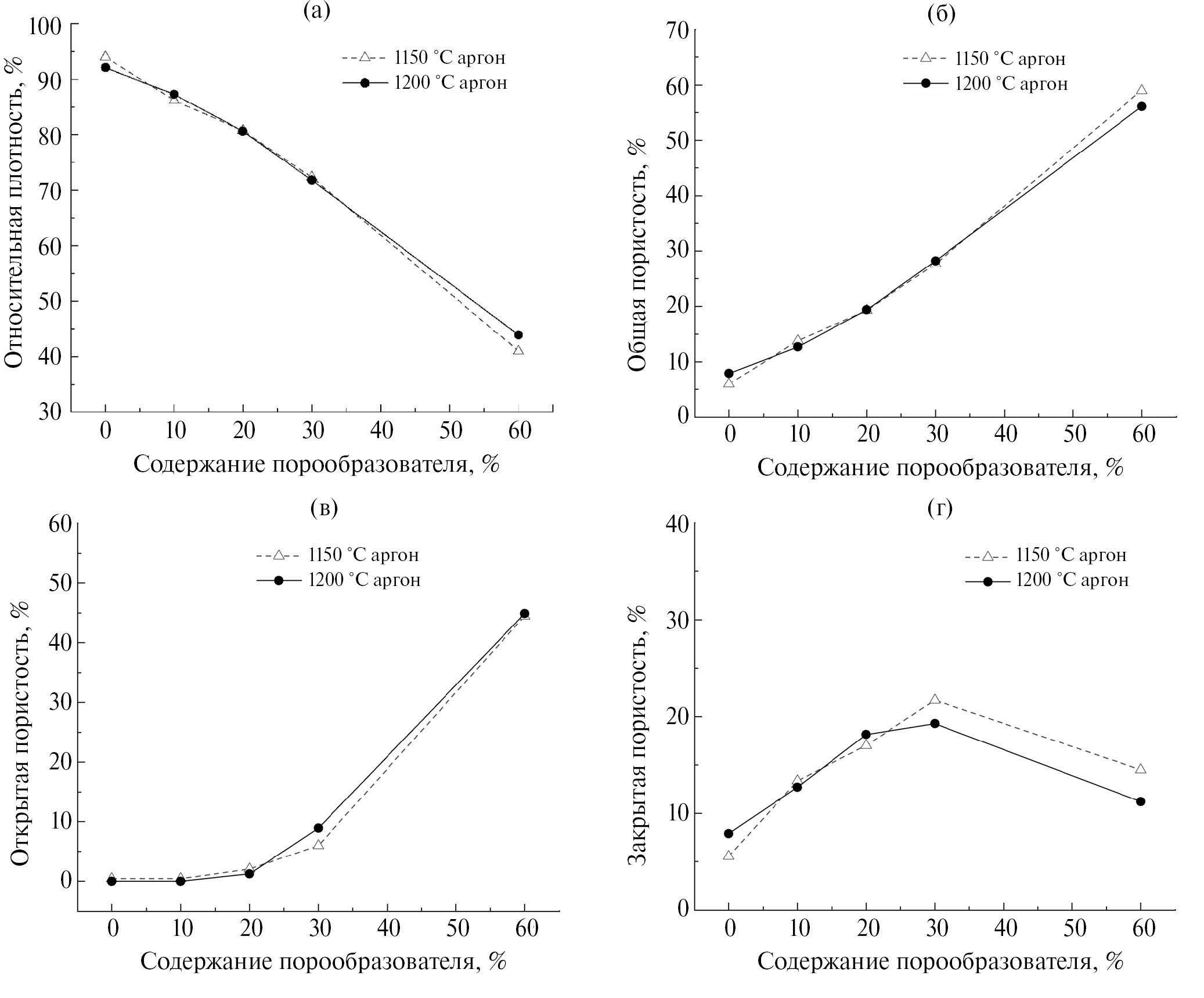 Рис. 5. Зависимости относительной плотности (а), общей (б), открытой (в), закрытой (г) пористости образцов, спеченных в аргоне, от содержания порообразователя в шихте