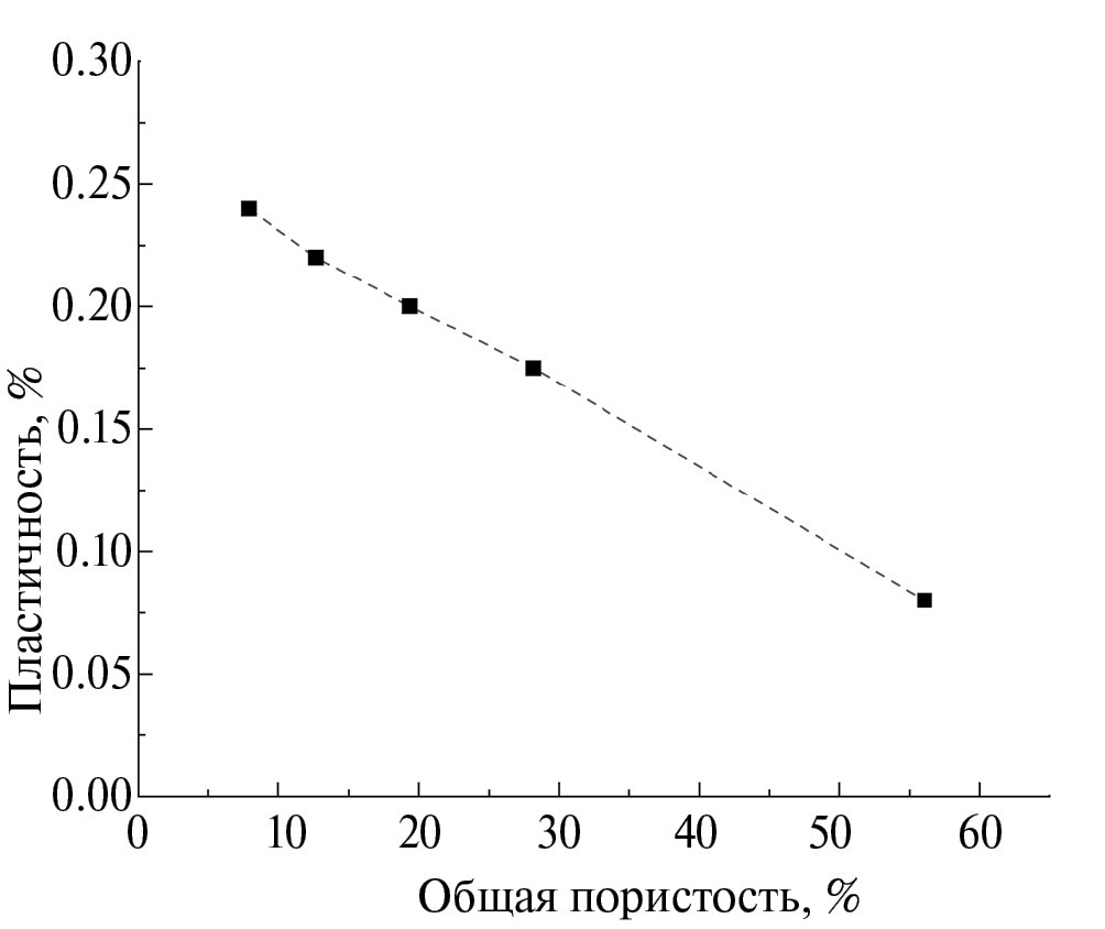 На рис. 6 приведены диаграммы деформирования образцов с разной пористостью, спеченных при 1200 °С в аргоне. Видно, что предел прочности на сжатие уменьшается на порядок при увеличении пористости от 7.9 до 56.1%. Сильно уменьшается пластичность (рис. 7), причем очевидно, что она связана с пористостью линейным законом.