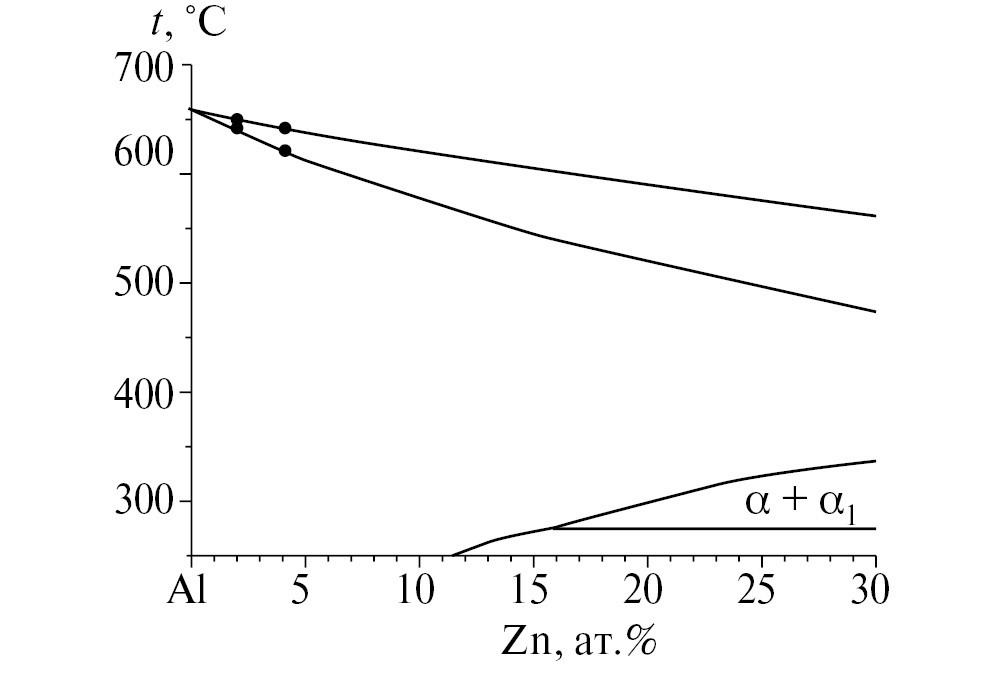 Синтезированные сплавлением материалы после уточнения химического состава микрорентгеноспектральным анализом содержали 4.7 мас. % (2.02 ат. %) Zn и 9.3 мас. % (4.09 ат. %) Zn, что отражено на фазовой диаграмме (рис. 1). Далее эти сплавы именуются Al-4Zn и Al-9Zn.