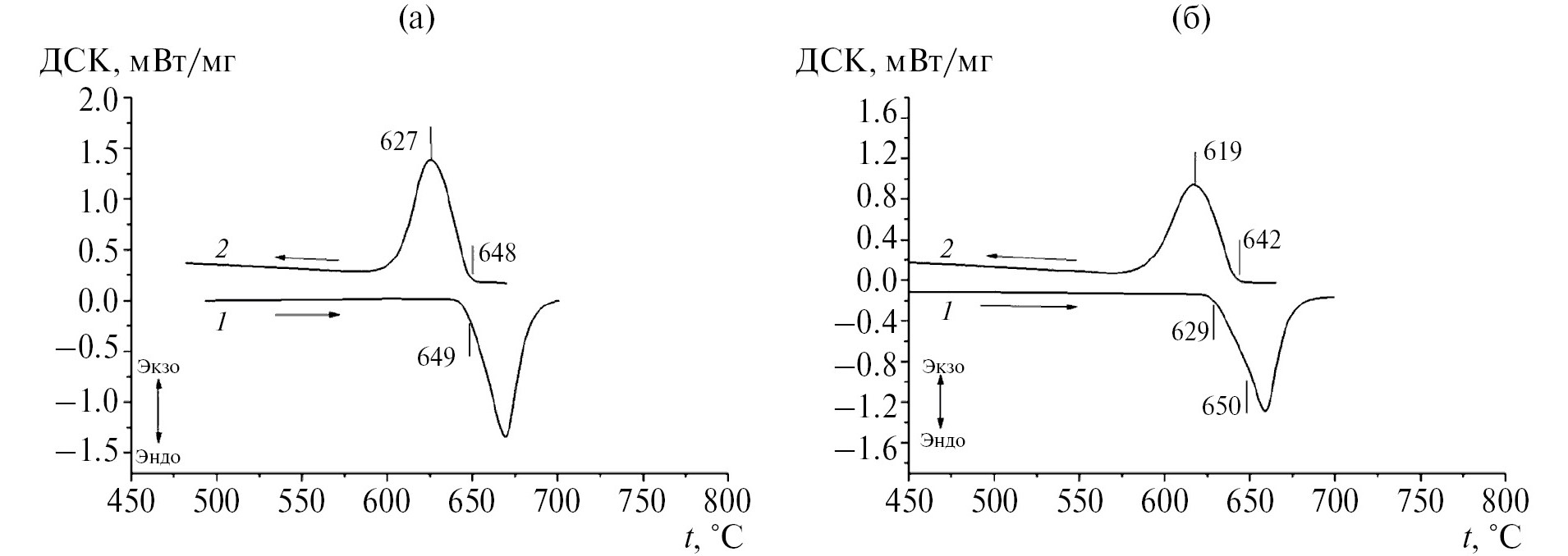 Рис. 3. ДБА-кривые плавления–кристаллизации при давлении 100 МПа двойных сплавов Al–4Zn (а) и Al–9Zn (б): 1 – кривые нагрева, 2 – кривые охлаждения
