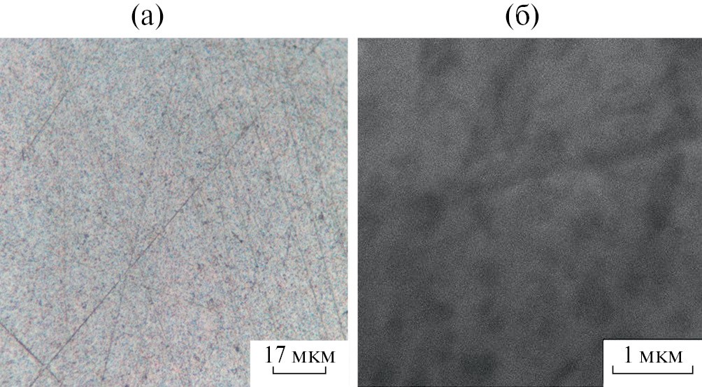 Микроструктура исходного литого сплава Al–4Zn по изображениям с увеличением от 1500 (оптическая микроскопия (ОМ)) до 70000 (сканирующая электронная микроскопия (СЭМ)) (рис. 4) показала отсутствие как микро-, так и наночастиц Zn в сплаве.