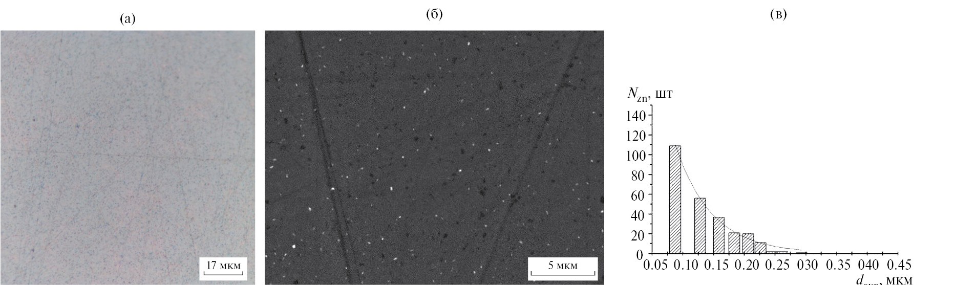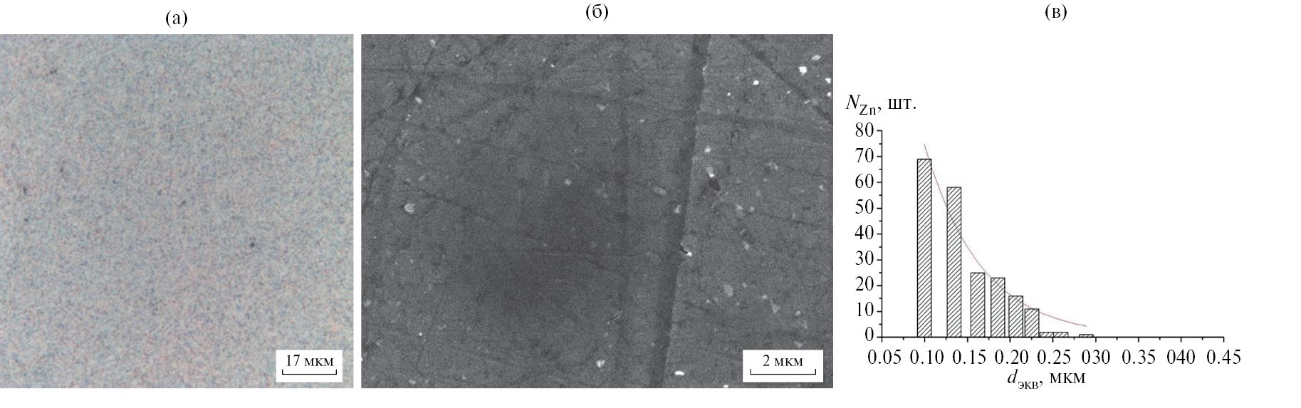 Пористость в синтезированных сплавах также отсутствовала, что можно связать с узкими интервалами кристаллизации в соответствии с фазовой диаграммой: 11 °С для сплава Al–4Zn и 22 °С для сплава Al–9Zn. По данным ОМ исходного литого сплава Al–9Zn (рис. 5а) частиц Zn на изображении не отметили, однако при использовании СЭМ установили наличие скоплений атомов цинка либо в виде сферических частиц, либо в виде зон Гинье-Престона, характерных для цинксодержащих сплавов [8–10]. Статистической обработкой изображения на рис. 5б (рис. 5в) для исходного сплава Al–9Zn установили средний эквивалентный диаметр Zn-частиц, равный 0.153 мкм, при объемной концентрации частиц 3.0×1011 см–3.