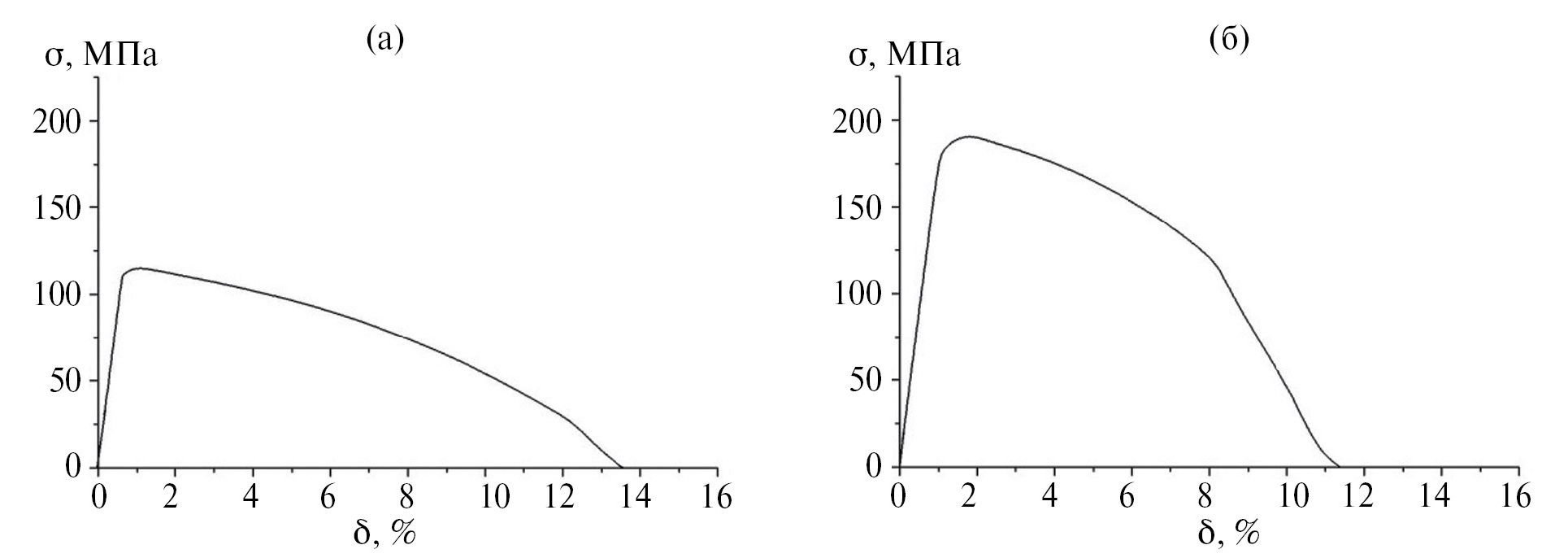 Рис. 8. Типичные кривые σ = f(δ) для двойных сплавов Al–4Zn (а) и Al–9Zn (б) после БТО (90 МПа/460 °С/3 ч) и пластического деформирования