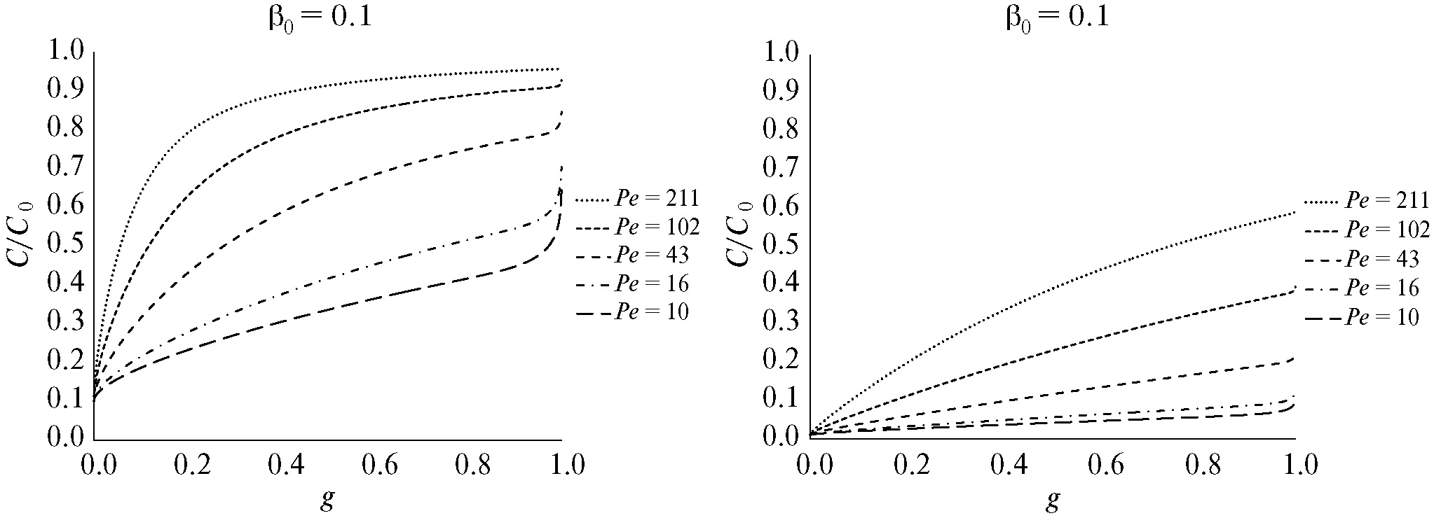Отклонение графиков зависимости С/C0 от g, построенных при Pe ≠ 0, от графиков, построенных при Pe = 0, зависит от β0 и Pe: отклонение уменьшается с уменьшением β0 и Pe. При β0 ≥ 0.5 расхождение заметно при Pe > 1, при β0 = 0.1 расхождение заметно только при Pe > 1-10, при β0 = 0.01 – при Pe > 10, а при β0 = 0.001 – при Pe > 100 (см. графики [6, 9–11]).