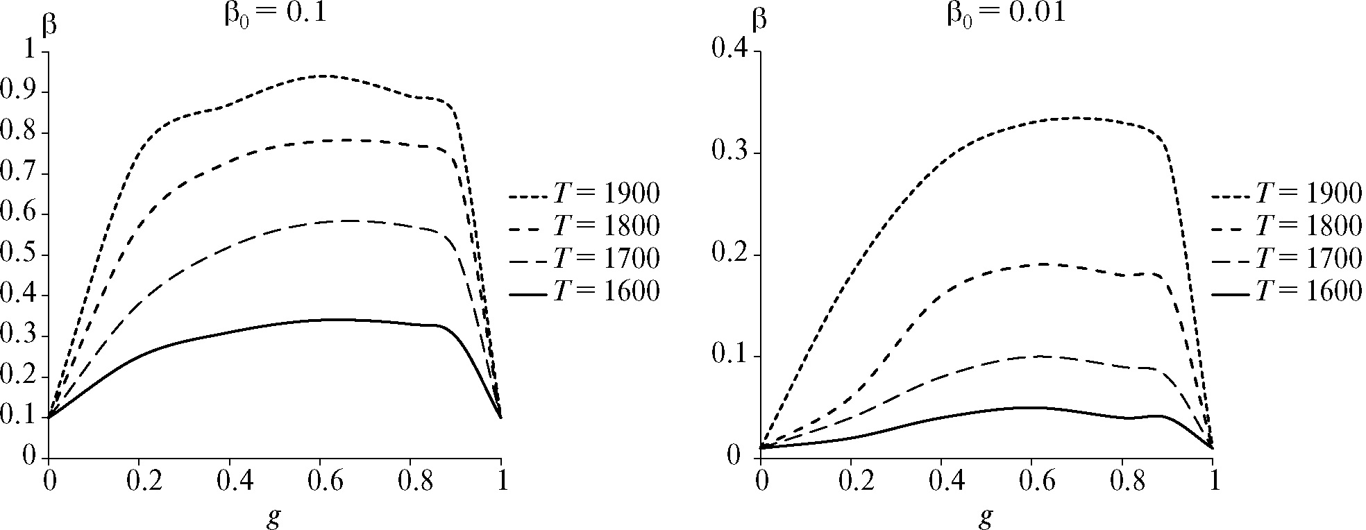 Данные табл. 2 и рис. 2 дают представление о характере зависимости β(g, T). Коэффициент β растет с ростом g и T. Зависимость β(g, T) более заметна при меньшем значении β0, большей температуре и большем значении Pem. Видно негативное влияние увеличения начальной толщины слоя жидкости X на эффективность рафинирования (для бериллия с Tm = 1551 K значение Pem = 10 соответствует X ~ 1 см, а Pem = 100 – X ~ 10 см).