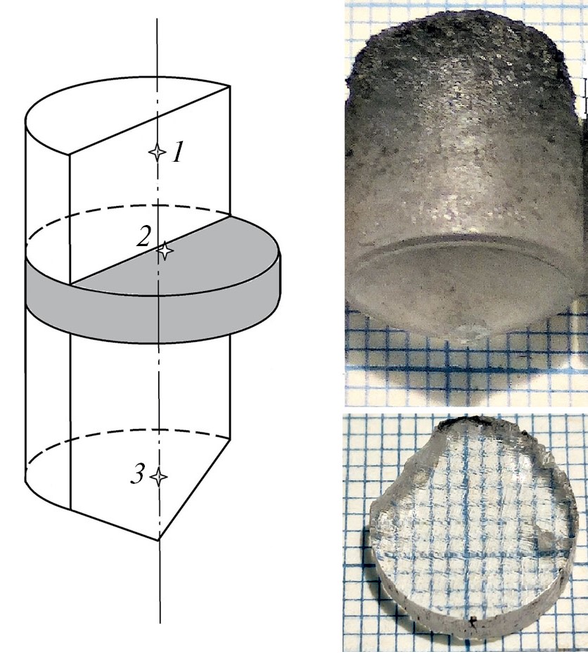 Рис. 1. Схематическое изображение разрезки кристалла: 1, 2 и 3 – позиции для РФлА
