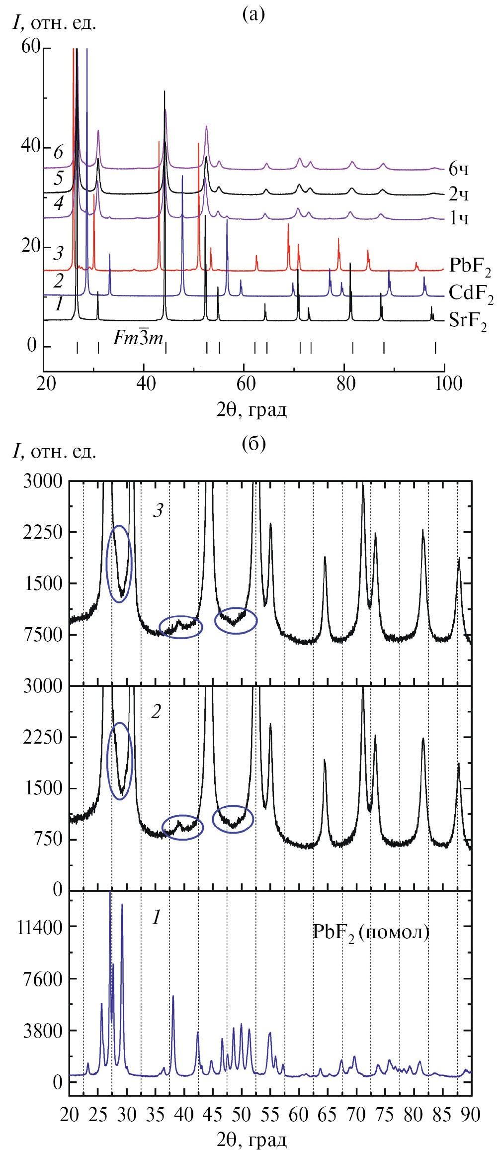 Динамика процесса образования твердого раствора из компонентов представлена на рис. 2а. Видно, что уже к окончанию 2 ч помола количество CdF2 снизилась до ~6 мас. %, а после 6 ч фторид кадмия уже отсутствовал в пределах точности РФА. Основная фаза относится к типу флюорита (пр. гр. ). Можно предположить, что небольшое количество наблюдаемой примеси, которое после 1 ч помола составляло ~ 4 мас. %, а после 6 ч 1–2 мас. %, соответствует ромбической фазе, изоструктурной низкотемпературной модификации α-PbF2. На рис 2б для сравнения приведена дифрактограмма ромбического фторида свинца (спектр 1), полученного после часового помола плавленого кубического PbF2. Как показано в [18], при получении двойного твердого раствора Pb0.67Cd0.33F2 из компонентов сначала образуется ромбическая фаза высокого давления на основе α-PbF2, которая постепенно переходит во флюоритовый твердый раствор.
