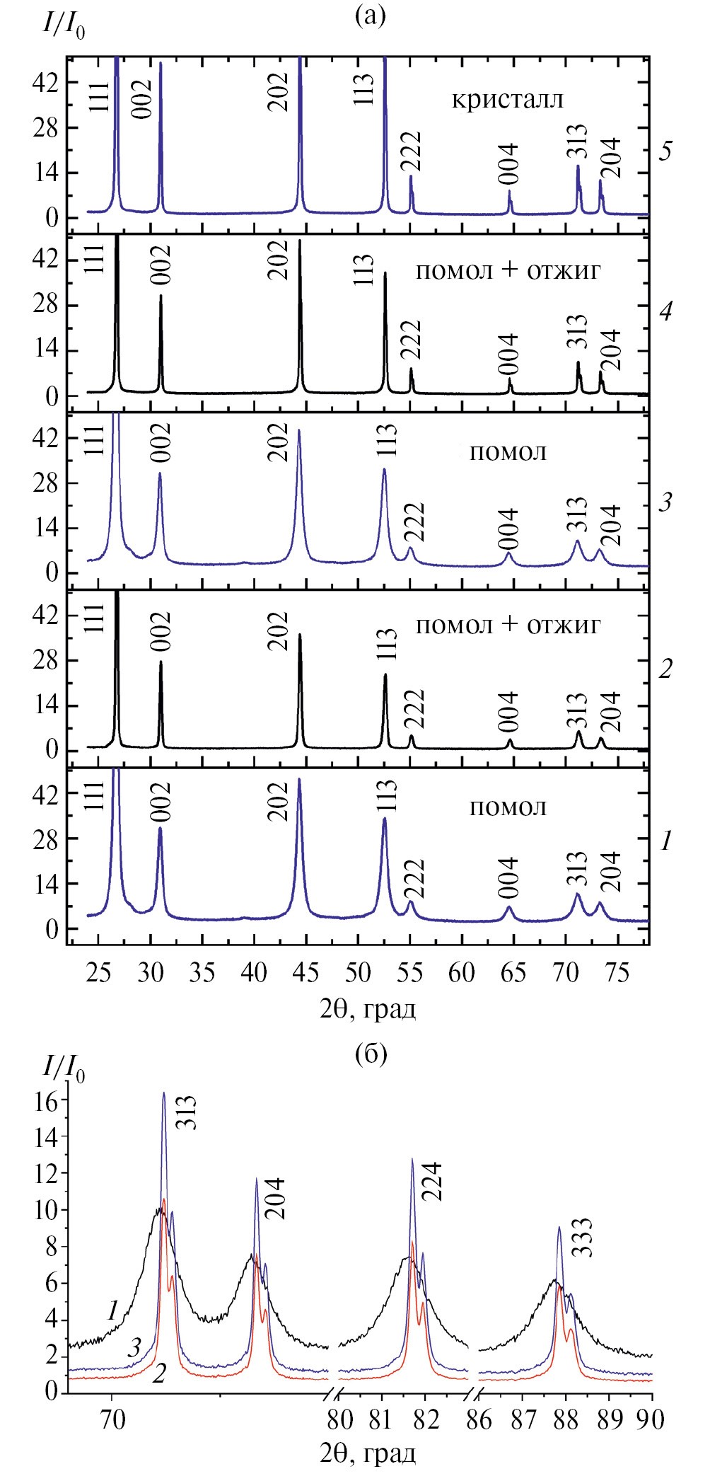 Рис. 3. Дифрактограммы твердого раствора (Pb0.67Cd0.33)0.825Sr0.175F2, механосинтезированного из отдельных компонентов до (1) и после (2) отжига, из сплава Pb0.67Cd0.33F2 и SrF2 до (3) и после (4) отжига и кристалла (5) (а); отдельные увеличенные рефлексы твердого раствора, механосинтезированного из Pb0.67Cd0.33F2 и SrF2 до (1) и после (2) отжига и кристалла (3) (б)