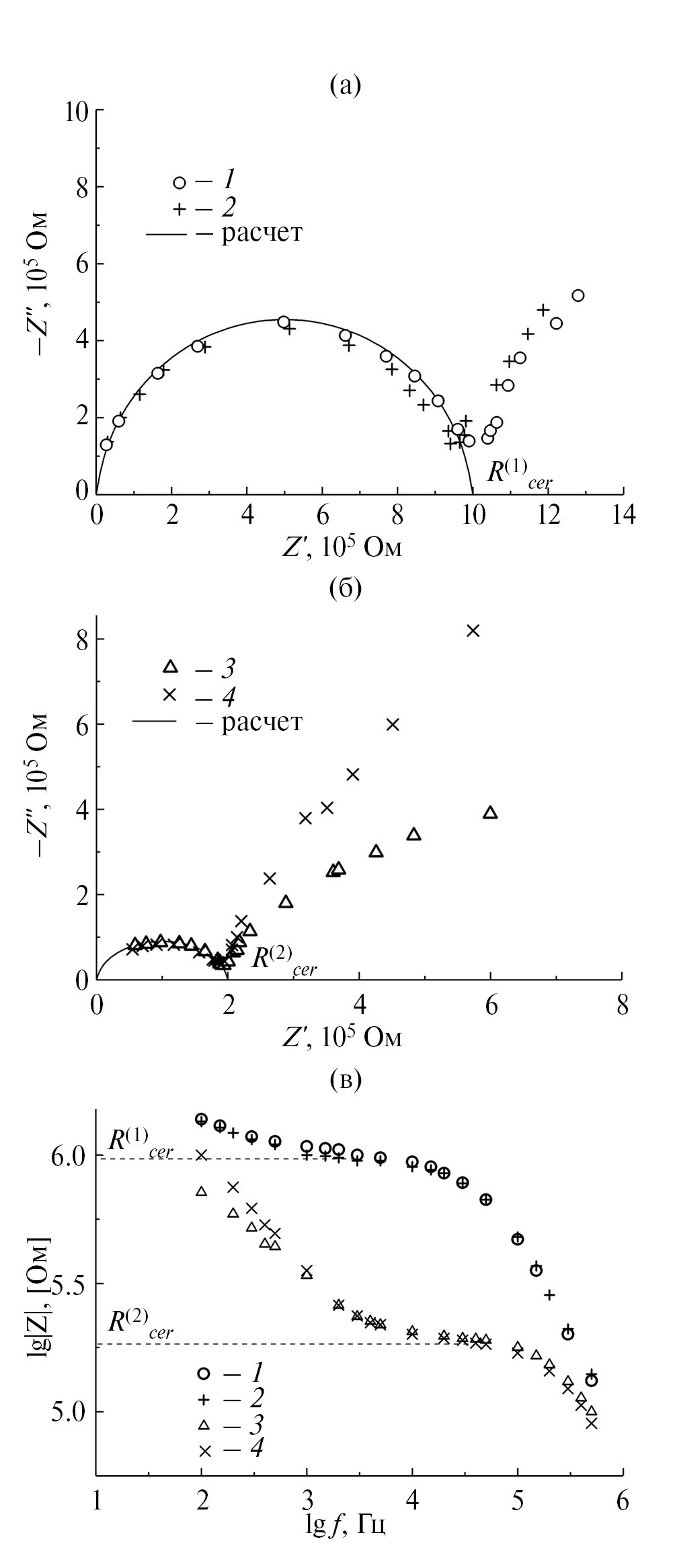 Пересечение годографа импеданса электрохимической ячейки с осью реальных сопротивлений (осью абсцисс) позволяет надежно определить сопротивление Rcer нанокерамики. Электропроводность керамических образцов определяли по формуле