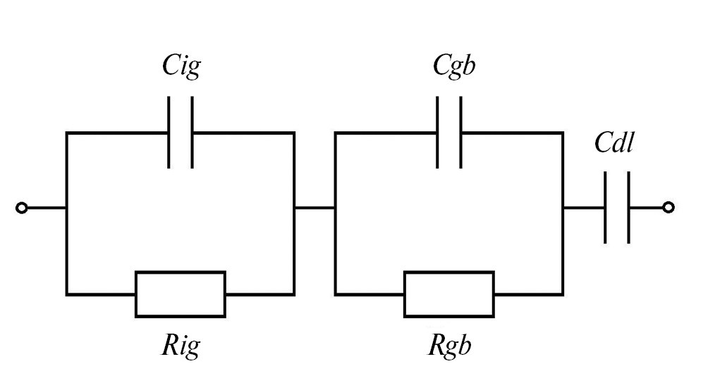 Эквивалентная электрическая схема переменного тока для системы Ag|(Pb0.67Cd0.33)0.825Sr0.175F2|Ag в общем виде показана на рис. 5, где Rcer = Rig + Rgb – общее сопротивление керамического образца, Rig и Cig – внутризеренные (interior grain) сопротивление и емкость, Rgb и Cgb – межзеренные (grain boundary) сопротивление и емкость, Cdl – емкость двойного слоя (double layer) границы керамика/электрод. Вклад внутризеренной и межзеренной составляющих может быть различным, поскольку зависит от многих факторов, таких как геометрия зерен и их дефектная структура.
