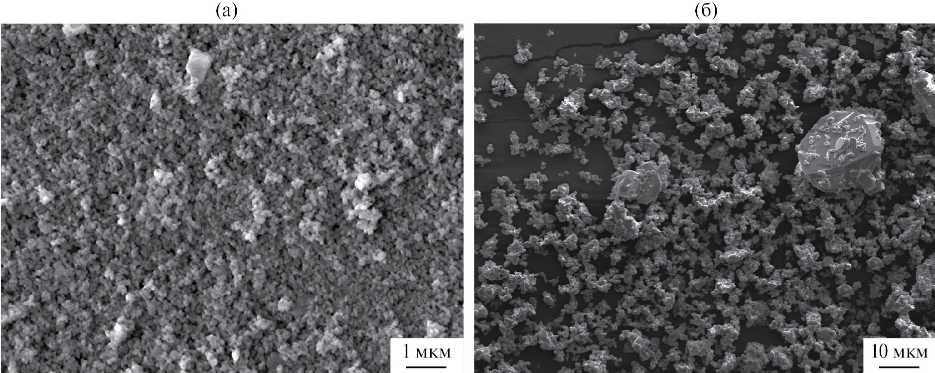 Рис. 1. РЭМ-изображения исходных порошков α-Al2O3 BMA-15 (а) и Cr2O3 (б)