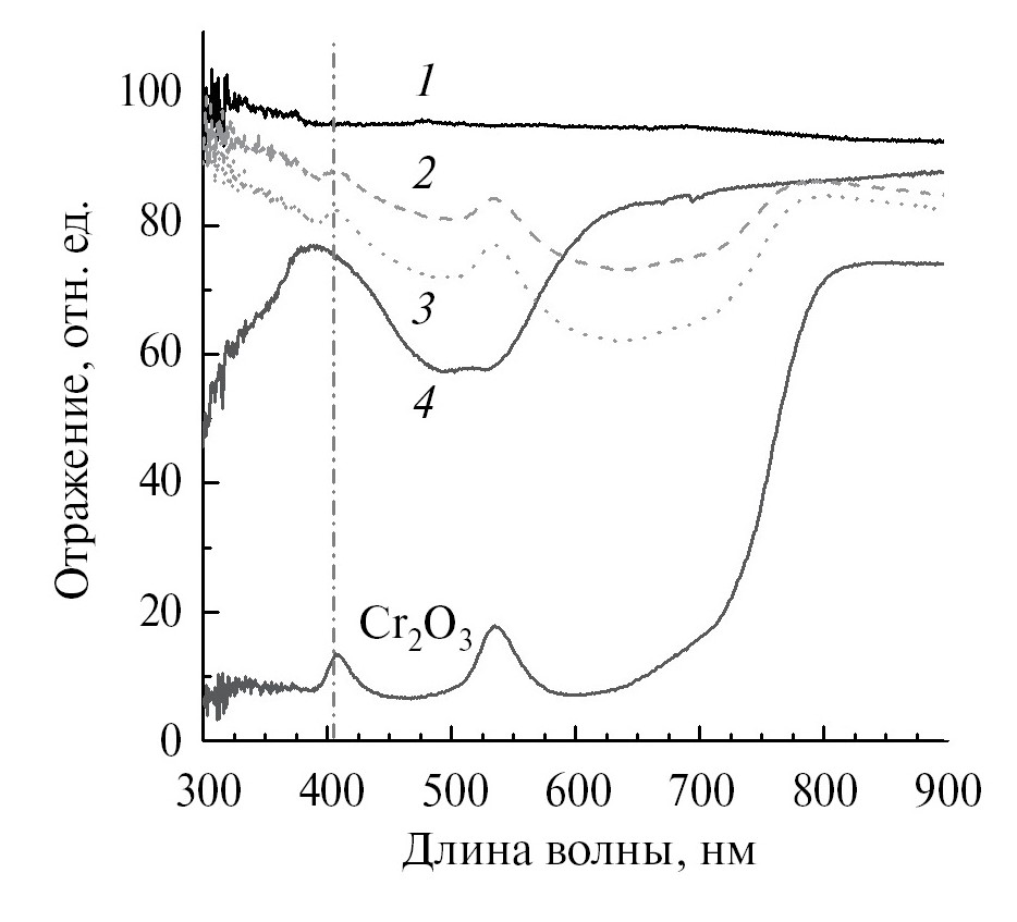 Рис. 2. Спектры диффузного отражения порошков Al2O3 (1), смесей Al2O3 + 0.13 мас. % Cr2O3 (2) и Al2O3 + 0.28 мас. % Cr2O3 (3), BK94-1 (4) и Cr2O3 (вертикальной штриховой линией при 405 нм обозначен максимум светимости УФ-источника, используемого в 3D-принтере Ember)